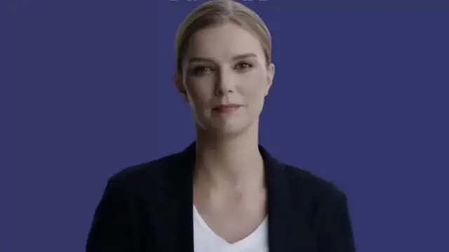 Waxay u muuq ektahay haweeney timo cad, oo xiran jaakad madow iyo funaanad cad.