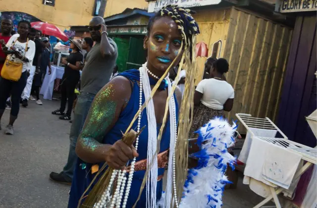 Qoraalka sawirka, Waa Sawir la qaaday 19 August, 2017 oo muujinaya haweeney qabta dhar midabbo leh intii laguguda jiray dabbaaldegga sannadlaha ah ee Chale Wote Street Art Festival oo ka dhacay James town, Accra.