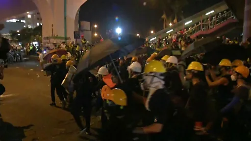 Booliska la dagaalama rabshada ayaa sunta dadka kaga ilmaysiisa iyo rasaas cinjir ah waxa ay ku ganeen dibadbaxayaasha Hong Kong ee ku sugnaa isu soo bax ballaaran oo dimuqraadiyadda lagu taageerayay, waxa ayna dacwado ku soo oogeen dibadbaxayaasha walxo ku soo tuura xariiqa booliska.