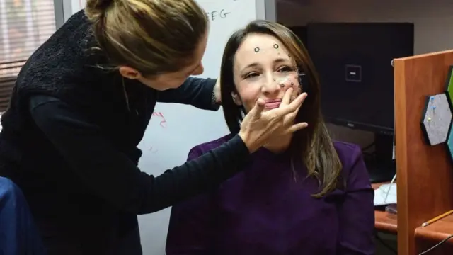Prof Yael Hanein ayaa dhanka bidix ee wejigayga ku dhejinaysa qalab electariinik ah oo lagu ogaado qofka beenta sheegaya.