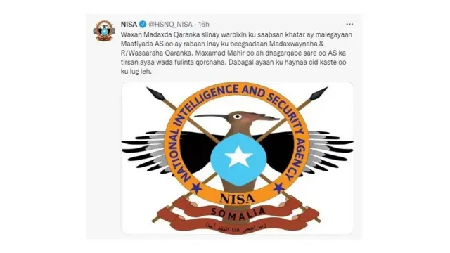 Qoraal lagu baahiyey barta Twitterka ee hay'adda NISA ayaa lagu sheegay inay xogta ay heleen ay la wadaageen madaxda sare.