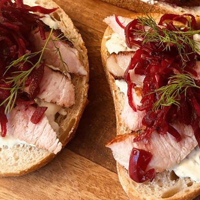 Grilled Bacon Chop On Toast with Fermented Red Cabbage, Beetroot And Apple, Mustard and Dill, Gherkin Sourcream