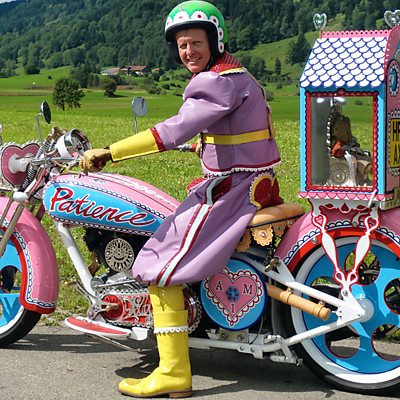 Grayson Perry and his teddy Alan Measles tour Bavaria on a customised motorcycle.