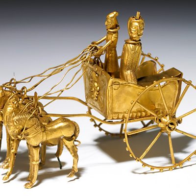 Neil MacGregor's world history told through objects at the British Museum arrives in Persia 2500 years ago. Throughout this week, Neil is looking at powerful leaders across the ancient world. Today he focuses on Cyrus, the first Persian emperor who created the largest empire the world had ever known. It stretched from Turkey to Pakistan and required a hugely sophisticated network of communications and control. At the heart of today's programme is a gold chariot pulled by four gold horses. This hand-sized model helps explain the rule of Cyrus, the "king of kings", and his ambitions for his vast territory - with contributions from the historian Tom Holland and Michael Axworthy of the University of Exeter. How does this glorious pre-Islamic past sit with the people of Iran today?