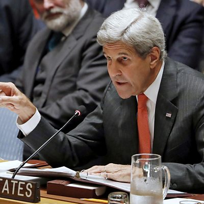 The US and Russia have clashed at the UN over the attack on an aid convoy in Syria. President Assad's adviser rejects John Kerry's proposal of a no-fly zone. Do we need to have a review of mental health services for young people? And the art of chatting to strangers. (Image: John Kerry at the UN. Credit: Reuters).