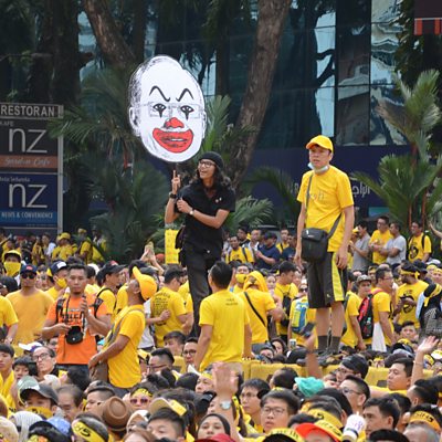 Malaysia's government is mired in scandal. Billions of dollars have been looted from a state investment fund. The Prime Minister is accused of receiving $681 million into his personal bank account, although he has denied any wrongdoing. Earlier this year, punk-inspired artist Fahmi Reza captured public dissatisfaction with an artwork caricaturing the PM as a clown. The image went viral, earning Reza comparisons to street-art provocateur Banksy. It also got him arrested and charged, one of an increasing number of Malaysians facing prison as the government ramps up its suppression of free speech and dissent. James Fletcher travels to Malaysia on the eve of a major protest rally in Kuala Lumpur. The protest movement is known as 'Bersih', meaning 'clean', and over the past few years they've mobilised hundreds of thousands of people on the streets, dressed in yellow t-shirts, to demand transparency, fair elections, and the PM's resignation. This year they're aiming for their biggest turnout yet. Fahmi Reza is designing placards for the protesters, and plans to attend carrying a giant version of his clown carricature. But the government is doing everything it can to stop the protest. And there's a new threat - pro-government protesters called the "redshirts", who have disrupted rallies with violence and threatened independent media and free speech advocates. James spends time with all sides as the protest unfolds. Can art and activism bring Malaysians on to the streets and spur change? Or will the government's crackdown, and the more direct methods of the "redshirts", dampen the protests and allow the PM to ride out criticism and stay in power? Image: The artist Fahmi Reza with his caricature of Malaysia’s Prime Minister Najib Razak at the Bersih 5 protest rally held on November 19, 2016. Photo Credit: BBC