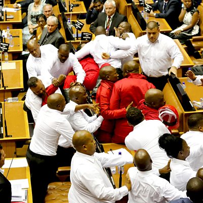 Chaotic scenes in the South African parliament as members of the opposition are dragged out by security guards. We debate the government's decision to stop taking in unaccompanied child refugees from the Continent. Why the government of Kenya is trying to close the world's biggest refugee camp. And Andrew Lloyd Webber becomes the first composer in more than sixty years to have four shows running on Broadway. (Picture: Security staff trying to eject EFF party MPs from South Africa's parliament Credit: REUTERS/Sumaya Hisham).