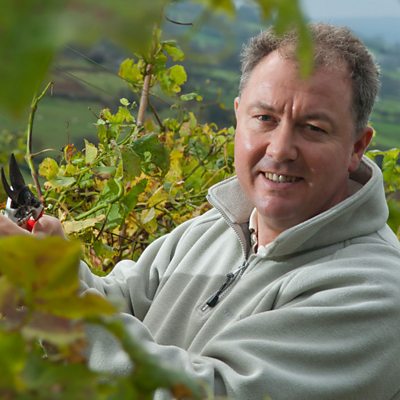 Beti George yn sgwrsio â Richard Huws o fferm Pant Du ym Mhenygroes. Mae'r busnes llewyrchus hwn yn gwerthu gwin, seidr, sudd afal, a dŵr ffynnon.