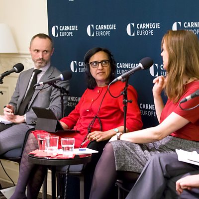 In March 1957, the Treaty of Rome establishing the EEC was signed by six founding members "determined to lay the foundations of an ever closer union among the peoples of Europe". Instead, 60 years on, Europe is facing fundamental questions in the wake of Brexit. Ritula Shah discussed the challenges facing the EU with 4 panelists at the Carnegie Europe thinktank in Brussels. (Photo: Ritula Shah with Daniel Hannan, Heather Grabbe, Tomas Valasek and Guntram Wolff. Credit: Hailing Wang).