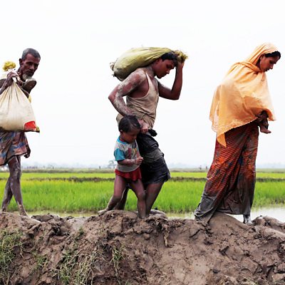 More than a hundred and forty thousand Rohingya Muslims have now fled across the border. Hurricane Irma causes massive damage on several Caribbean islands The murder of an Indian journalist who spoke out about the dangers of Hindu nationalism Canada gives sanctuary to gay men and women from Chechnya (Photo : Rohingya refugees walk on muddy path after crossing Bangladesh-Myanmar border, in Teknaf; credit - Reuters).