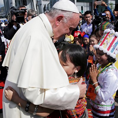 The Pope has arrived in Myanmar - but will he say the 'R' word - 'Rohingya'? Christians in the country are nervous about the repercussions if Pope Francis champions the plight of the Muslim minority - we hear the views of Bishop Nazir Ali. Also does Prince Harry's engagement to Meghan Markle mark a new chapter for the Royal Family and for the UK? Afua Hirsch, author of the book 'Brit (ish), and Rachel Johnson, journalist and author, discuss the evolution of the British monarchy. What are the health impacts of being born near an area with an oil spill? We have a special report from Nigeria. Picture: Pope Francis embraces a child in Yangon Credit: Reuters.