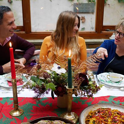 Sheila Dillon invites some special guests, friends old and new, to come and share a festive meal. Before they start to arrive, Nigel Slater drops by to help Sheila prepare. Each visitor will bring a dish, or a drink, that for them captures something unique of the flavours and spirit of the season. Knocking on Sheila's door are: Giorgio Locatelli, Angela Hartnett, Anna Jones, Pete Brown, Neil Borthwick and Yotam Ottolenghi. Presenter: Sheila Dillon Producer: Rich Ward.