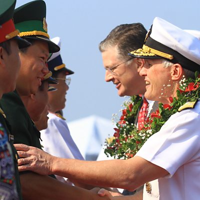 For the first time since the Vietnam War, a US aircraft carrier has arrived in the country. Kate Adie introduces stories, wit, and analysis from correspondents around the world: Jonathan Head watches a show of military diplomacy as a 100,000 tonne, nuclear-powered carrier docks in Vietnamese waters with more than 5,000 crew and 70 aircraft on board. A spot of misery tourism and a night on the town in Dublin help Louise Cooper understand what's really going on in Ireland's economy. At the height of the European migrant crisis, Richard Hall walked the Balkan route. As he retraces his footsteps he finds fewer migrants but more dangers. In Democratic Republic of Congo, Sally Howard joins the impressively dressed lady dandies or sapeuses. And what's it like to be teased by the Dalai Lama? Justin Rowlatt finds out. Producer: Joe Kent.