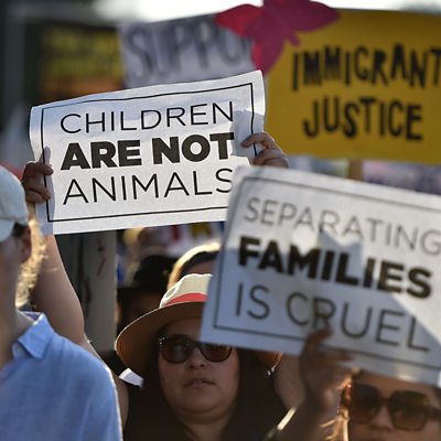 President Trump has blamed the Democrats for his policy of separating the children of migrants from their parents -- we hear from a congressman who has visited the shelters today and from a Trump supporter. Angela Merkel's interior minister gives her an ultimatum on migration -- strike a Europe wide deal by the end of the month or migrants will be turned away at the German border. As the prime minister admits that taxes will have to rise to pay for an NHS funding boost - we discuss whether the move marks a departure for the Conservative party. And we continue our Russian odyssey with Jamie Coomarasamy in a city of Kostroma asking what Russians think about the Me Too movement.. (Picture: Families Belong Together March in Los Angeles Credit: Getty).