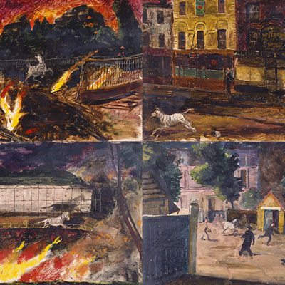 War is often described as a dehumanising process. But what happened to Britain’s non-human inhabitants in this terrible conflict? In a painting in Manchester City Art Gallery, a zebra rears up, black and white striking against the terrible night scene. The sky reddens in the distance from a vast explosion in 1940. War artist Carel Weight painted the zebra that galloped out of the zoo in to the maddened city. The animal escaped unscathed, but thousands of animals didn't. Four panels show the journey of the terrified zebra and close on his hooves are sketchy figures, trying to capture the fleeing animal. One of them may have been a keeper at London Zoo at the time, called Shelley. In this feature, it's an imaginary Shelley who tells us what happened, recalling the night the Zebra House was bombed, along with the goings-on at city zoos during World War Two. Between archive footage, the rumble and shock of explosions, the voices of non-human creatures and of human historians, we hear how animals in zoos fared, along with the terrible fate of 400,000 cats and dogs, killed in September 1939, on the orders of their anxious owners who feared the onslaught of war. It was at London Zoo that Julian Huxley, then Secretary of the Zoological Society, would try and spare the animals the sounds of bombing and sirens drowning out the destruction with gramophones playing the music of Sibelius. Animals were central to the way Churchill imagined the conflict. Visiting London Zoo in 1939, as war loomed ever closer, Churchill learned that the zookeepers were primed to shoot top predators: the lions and tigers if they escaped. As recorded by Huxley in his memoirs, Churchill replied ‘What a pity!’ before staring into the middle distance and conjuring for him an extraordinary and disturbing apocalyptic fantasy. Churchill’s vision was a London of fire, burning wreckage, the noises of war, and big cats roaming the bombed out streets in search of dead bodies. Peter Markinker is the voice of Shelley. Contributors include the historians Marianne Sommer, Richard Sam Deese, Hilda Keane and Andy Flack; Archivist Sarah Broadhurst and Curator Hannah Williamson. Devised by David Barnes and produced by Kate Bland A Cast Iron Radio Production for BBC Radio 3.