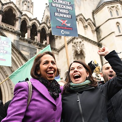 (Campaigners outside Royal Courts of Justice in London after they won Court of Appeal challenge against 3rd runway at Heathrow. credit: Press Association)