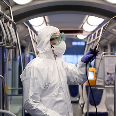 An employee wearing a protective jumpsuit disinfects a local tram in Zagreb as a precaution against the spread of COVID-19 (Photo by DAMIR SENCAR/AFP via Getty Images)