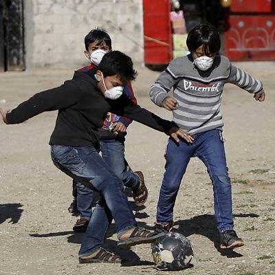 (Pic: Boys wearing protective and N95 masks play with a football outside their homes in Gaza City) (Credit: MOHAMMED ABED/AFP via Getty Images)
