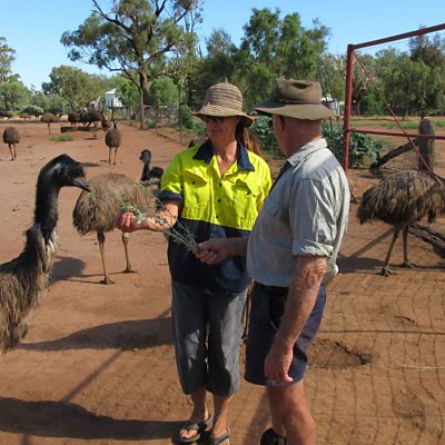 Emus are well-known as a native bird in Australia, but they are also now farmed for their meat and their oil. In this programme, Peter Hadfield visits a farm in New South Wales, around 300 miles from Sydney, where Phil and Penny Henley have been farming the land for the last twenty years. As well as sheep and cattle, they have about 1200 emus, which they hatch and rear on the farm. Peter meets the emus, finds out about the distinctive drumming noise which the females make, and visits the farm shop where products made from emu oil are on sale. He also finds out how recent droughts in Australia have affected the farm, and stops to admire the amazing views the farm has of the nearby Warrumbungle National Park. Produced and presented by Peter Hadfield.