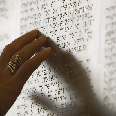 The Life in the UK test allows people to apply for British citizenship and its a test that requires substantial revision and preparation. Brian Alyward is originally from the Republic of Ireland, and he explains what happened when he initially found that the revision and preparation materials were not provided in his preferred format; braille. When it comes to enjoying art work, it can be dependent as much on texture as it is on visual effect. There have been many blind or partially sighted artists over the years who have used their changing eyesight to add individuality to their interpretations of art. So when we heard about a recent exhibition in London, that featured the work of blind or visually impaired artists, we wanted to know what it was all about. Our reporter Fern Lulham attended the exhibition and spoke to some artists about their fascinating creations. Presenter: Peter White Producer: Beth Hemmings Website image description: pictured is a large white wall with scripture printed in braille markings. To the left of the image is a woman's hand feeling along the tactile braille markings. She is wearing a large golden ring.