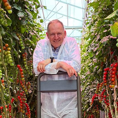 Caz Graham meets Andy Roe, self confessed tomato fanatic, at the huge indoor tomato farm he runs in Lancashire. Andy is the tomato production manager at Flavourfresh, which produces 2,700 tonnes of them every year. They're grown in large glasshouses, where individual plants can reach 15 metres in length, their stems intertwined above specially created grow bags. The company uses LED lights to enable them to produce tomatoes all year round. Caz also meets Dave Barker as he introduces pollinators and natural pest predators into the greenhouse, and joins one of the company's seasonal workers as they harvest the tomatoes. Produced by Sally Challoner