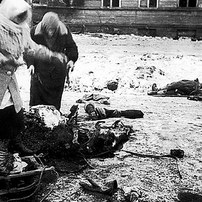 When Leningrad was cut off from the rest of Russia by German troops during World War Two, one third of its population died. Some were killed in the fighting, but most died of hunger. (Photo: Two women collect remains of a dead horse for food, during the siege of Leningrad) (Credit: World History Archive/TopFoto)