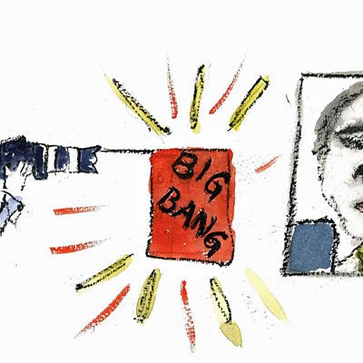 We hear from Nobel prize-winning physicist George Smoot III about that mind boggling moment 14 billion years ago when the awesome explosion that is the Big Bang created our universe. He is now trying to get to grips with the very nature of the dark matter that makes up our cosmos, something which we think is there although we can't see it, or even measure it. We'll also hear from celebrity photographer Platon. What it's like to have a few seconds to take a snapshot of the world's most powerful and notorious leaders from Robert Mugabe to Tony Blair? How does he find the person behind the mask of power? He regales the stories of getting global leaders to collaborate with him. And what about the terrifying irreversible moment when a gun fires? Senior Advisor at the Global Fund for Women, Kavita Ramdas, tells us how women can fight back against the tide of small arms flooding their communities. Illustration by Emily Kasriel: the power of a Big Bang to shoot the world's leaders.