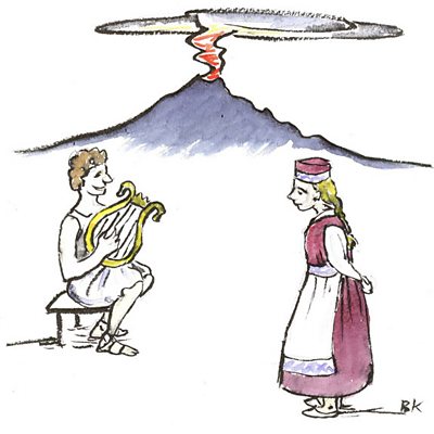 Could the current Eurozone crisis signal the start of terminal decline for the continent? Or is there something about Europe's rich cultural vibrancy that will help it through the current troubles? Or perhaps the real reason why civilisations come and go has nothing to do with human activity but the knock on effects of earthquakes, volcanic eruptions and other forces of nature we cannot control. This week's guests are Greek archaeologist, Yannis Hamilakis, British volcano expert, Clive Oppenheimer, and from Latvia, the country’s first female President and authority on Latvia’s oral folk tradition, Vaira Vike-Freiberga. Illustration by Bridget Kendall: A poet from ancient Crete sings to a Latvian girl about a volcano.