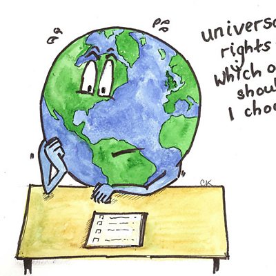 Rights: Is it right to use an embryo for life-saving research? Can the free market really ensure rights for all? If you need to, should you bribe someone to get your driver’s licence? We feel entitled to many rights, and exercise them daily, but what cornerstone are they built on? As people in the Arab world fight for their rights, we debate on what grounds we are owed anything by anyone. This week’s Forum guests are India’s chief economic advisor, Kaushik Basu; British philosopher Mary Warnock; and cutting-edge stem cell biologist Tilo Kunath. Illustration by Charlotte Kingston: the world puzzles over which rights to write.