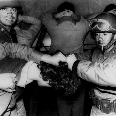 Just before the 1968 Olympics, the Mexican government cracked down hard against student demonstrators. Some were killed, others arrested - David Huerta was one of the young protestors, hear his story. Photo: Mexican soldiers arresting students after the shooting (Associated Press).