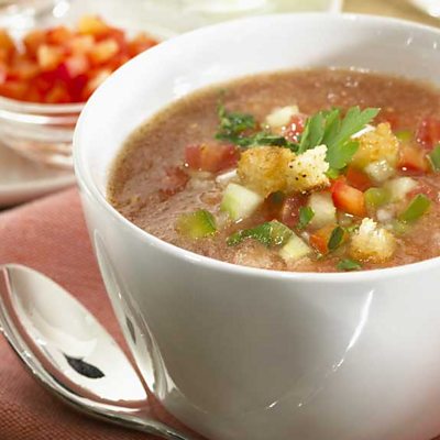 Food writer Felicity Cloake creates the perfect Gazpacho. A Spanish classic, this chilled soup originates from southern Andalucia and is essentially a peasant dish, designed to make use of cheap very ripe Mediterranean ingredients. The recipe can vary but is a combination of some or all of the following - tomatoes, peppers, garlic, cucumber, not forgetting crusty white bread, sherry vinegar and a generous slug of olive oil. This recipe is taken from '68 Essential Recipes for Every Cook’s Repertoire' by Felicity Cloake.