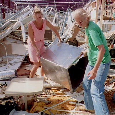 In August 1992, Hurricane Andrew hit southern Florida, killing 44 people and causing billions of dollars of damage. Amid the chaos, weather forecaster Bryan Norcross stayed on air, dispensing calm advice to his viewers. The marathon broadcast made him a local hero. Bryan Norcoss recalls the hurricane for Witness. The audio in this programme was provided by The Lynn and Louis Wolfson II Florida Moving Image Archives (Image: Two people clearing rubble away from their family store. Credit: AFP)