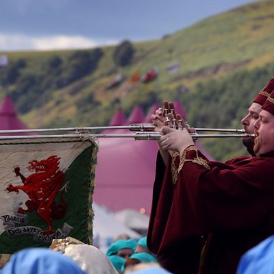 Nia Lloyd Jones yn sgwrsio hefo hogia'r Corn Gwlad yn yr Eisteddfod Genedlaethol.