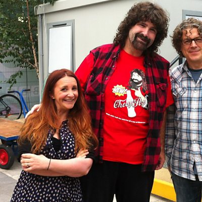 Stars Lucy Porter,Mick Foley and Alan Davies join Fred on the sofa.