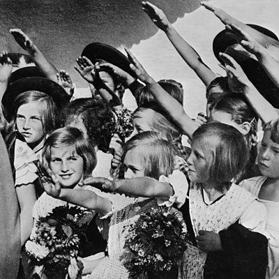 In the 1930s the Nazi party hatched a secret plan to breed an elite race of blonde blue eyed children. Young German women were told it was their duty to have affairs with SS officers in order to create Aryan babies. The breeding programme was managed by the Lebensborn organisation. Image: Ayran German children greet Hitler in 1937 (Getty Images)