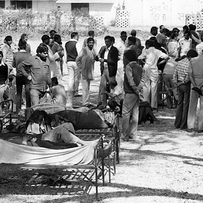 In December 1984 thousands of people in the Indian city of Bhopal were killed by leak from a chemical plant. The city was enveloped by a cloud of poisonous gas. Two survivors of the disaster have spoken to Witness. Photo:Waiting for treatment outside the hospital. Copyright: Bedi/AFP/Getty Images