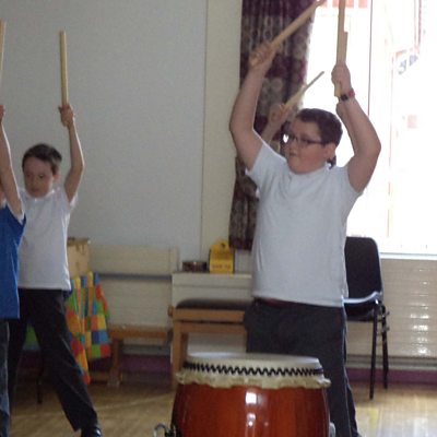 Pupils of Cumber Claudy PS & St Colmcille's PS in their Japanese drumming class, Claudy.