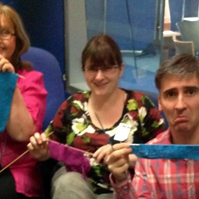 Daf a Caryl yn trafod gwau gydag Eluned Winney ac Alun Rhys Jenkins