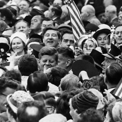 In June 1963 the US President John F Kennedy made a state visit to Ireland, his ancestral home. Irish novelist Colm Toibin remembers the effect he had on the people lining the streets to welcome him. (Image: President John F Kennedy in the middle of a crowd. Credit: Keystone/Getty Images)