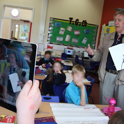 Hywel Gwynfryn yn ysgol T Llew Jones ac yn clywed am brosiect ffilm 'Cadw'r Cof'.