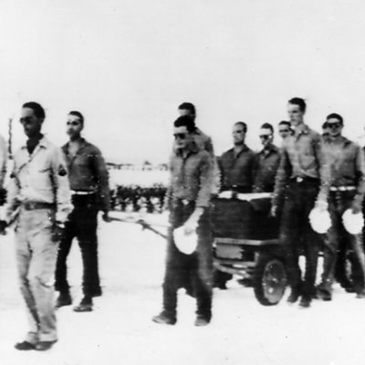 In the last days of World War II, an American warship, the USS Indianapolis, was torpedoed in the Pacific. For days, no one came to the survivors' rescue. Left adrift in shark-infested waters, hundreds of sailors died. We hear from Loel Dean Cox one of the few who survived. (Photo: Last rites for a crew member held by ship mates and men from the US base Peleliu) (Credit: TopFoto)