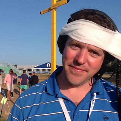 Live recording of the moment golf commentator Alistair Bruce-Ball was hit by Brandt Snedeker's ball, at the Open championship in Muirfield; plus his very understated reaction. Alistair's headphones thankfully took the force.
