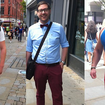 A survey shows half of us don't like seeing men wearing bright red trousers. 5 live's Rowan Bridge has been to Manchester city centre to speak to men wearing them.