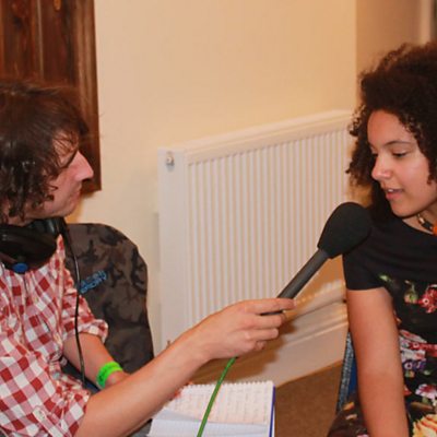 Gethin Evans yn sgwrsio gyda Kizzy Crawford yn gig Cymdeithas yr Iaith Eisteddfod Dinbych.
