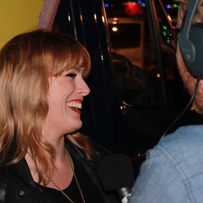 Gwenno Saunders yn sgwrsio gyda Huw Stephens ar ol chwarae gig Maes B.