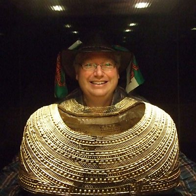 Aled Lewis Evans o Wrecsam yn sgwrsio gydag Owain Gwilym am yr het.