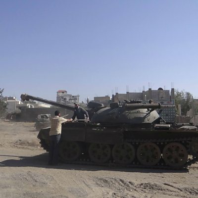 Haman from Deraa tells WHYS about why he decided to flee Syria with his twelve children. Photo shows Free Syrian Army fighters at a tank that belonged to forces loyal to Syria's President Bashar al-Assad in Deraa - by REUTERS/Ibrahim al-Hariri.