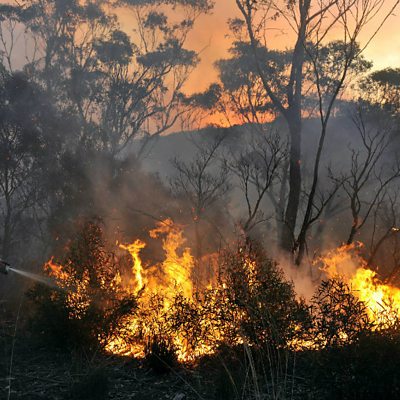 As the emergency services tackle huge bush fires in New South Wales, we hear the latest from Australia and also talk to firefighters around the world about the dangers and realities of their profession. Photo: A firefighter tackles a blaze near the village of Bell in the Blue Mountains. Picture: Associated Press.