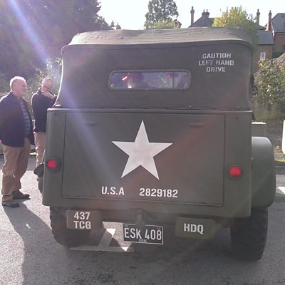 Today, Ben's at Hungerford Railway Station where the majority of American troops arrived. With Ben is local historian Roger Day, enthusiast Neil Stevens who grew up in Marlborough, Andy Harding from Swindon whose grandfather was an American paratrooper and Chris Main who owns the wheels.