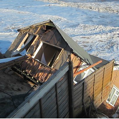 Steven Connolly, who has lived in a beach chalet in Hembsy in Norfolk for the last seven years, speaks about how he returned from the pub to find it collapsing into the sea. "I just managed to get in there and rescue a few bits and get my cats out, and then people from all over the place helped to form a human chain to help get a load of the belongings out and then it just collapsed," Mr Connolly said.